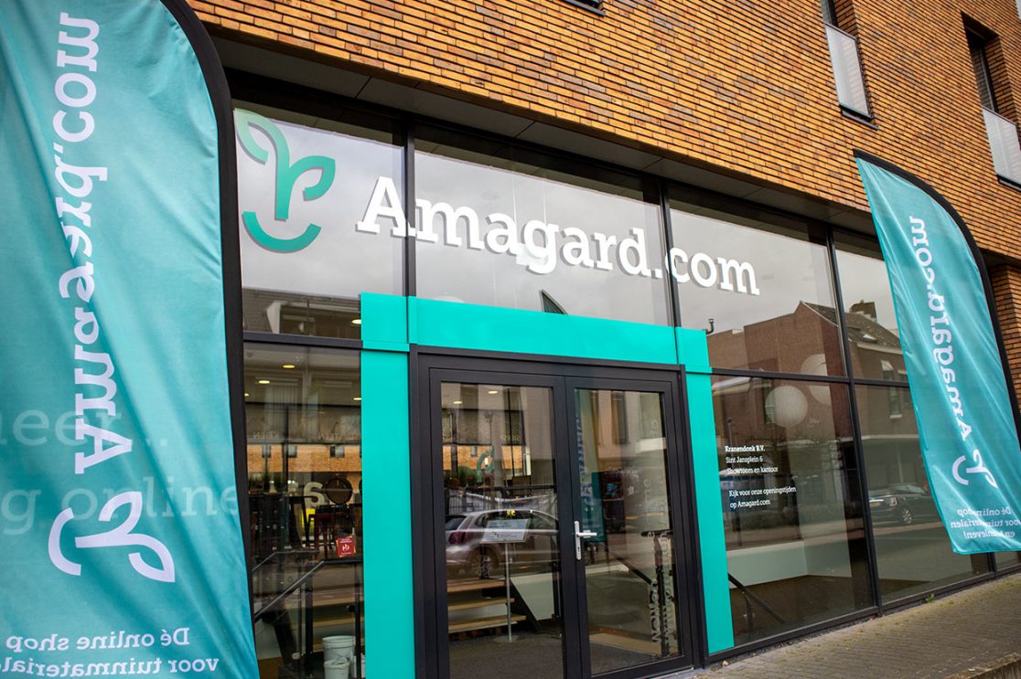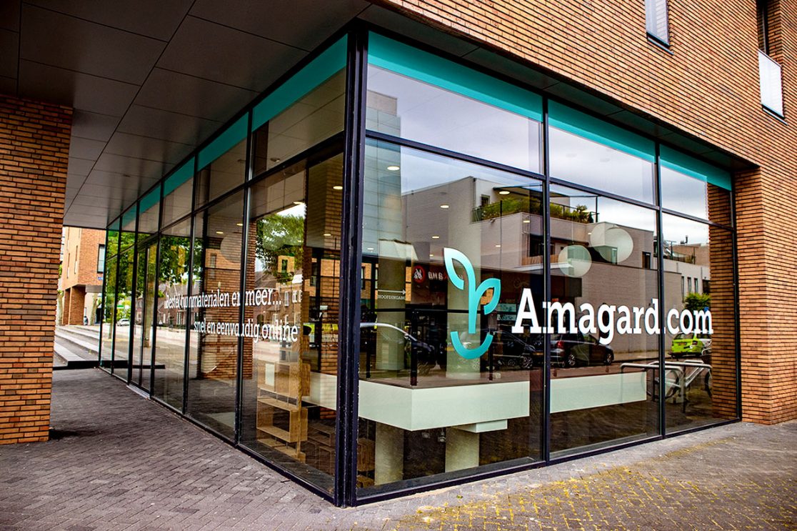 Ontwerp voor de aankleding van de gevels van het pand van Amagard.com. De toepassing van de band in de huisstijlkleur groen creëert eenheid en accentueert de hoofdingang.