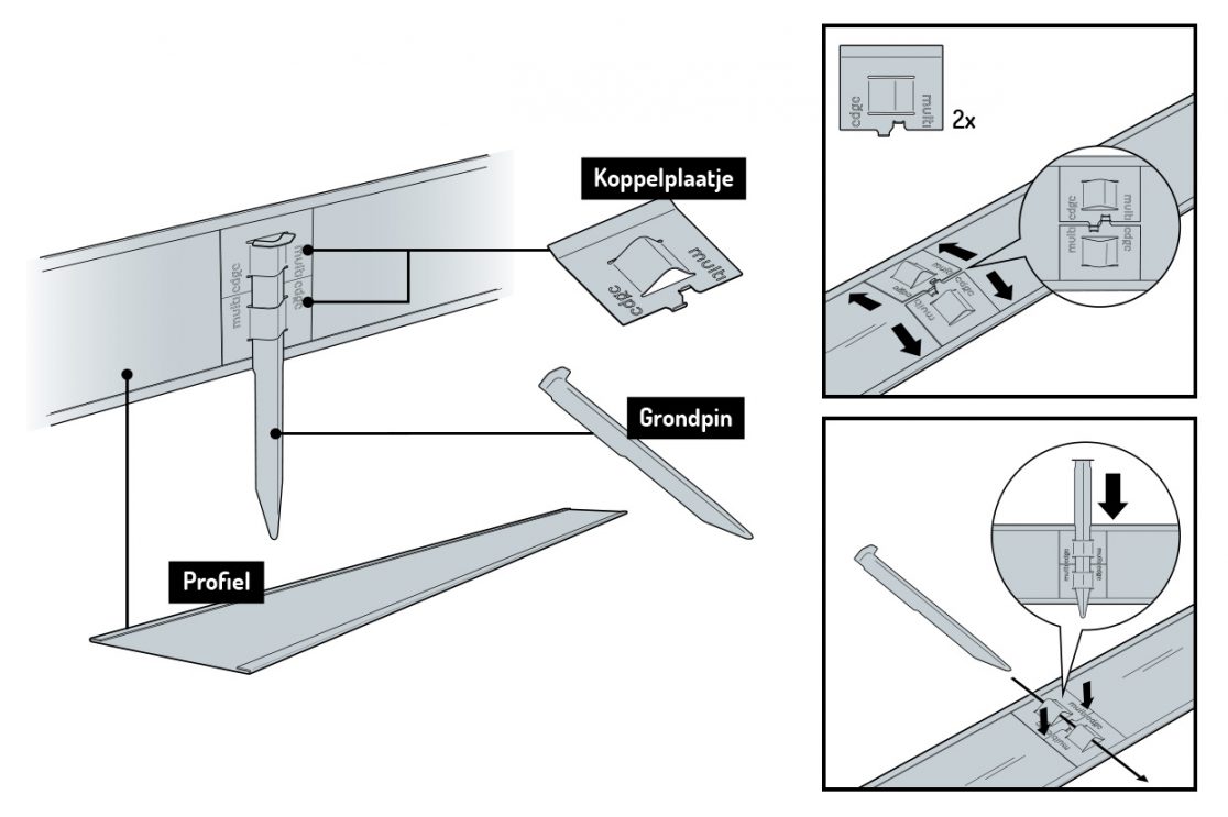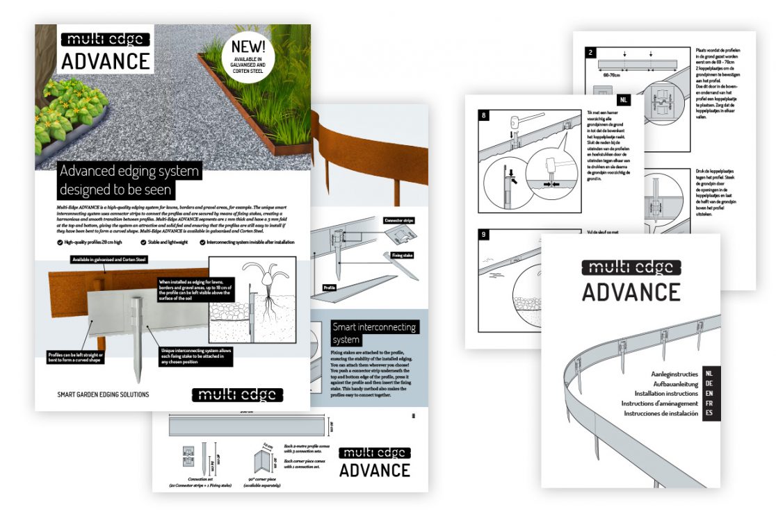 De vraag naar metalen kantopsluitingen van zowel corten als verzinkt staal is enorm gestegen de afgelopen jaren. Een antwoord op deze stijgende vraag is de Multi-Edge Advance. Een product met de focus op gebruiksvriendelijk aanleggen en een strakke afwerking. Dit is bereikt door het slimme koppelsysteem waardoor de grondpinnen op elke gewenste plek aan de afboording bevestigd kunnen worden voor optimale stabiliteit en vormvrijheid. Bovendien zorgt het voor een strakke overgang tussen de afboordingsdelen.